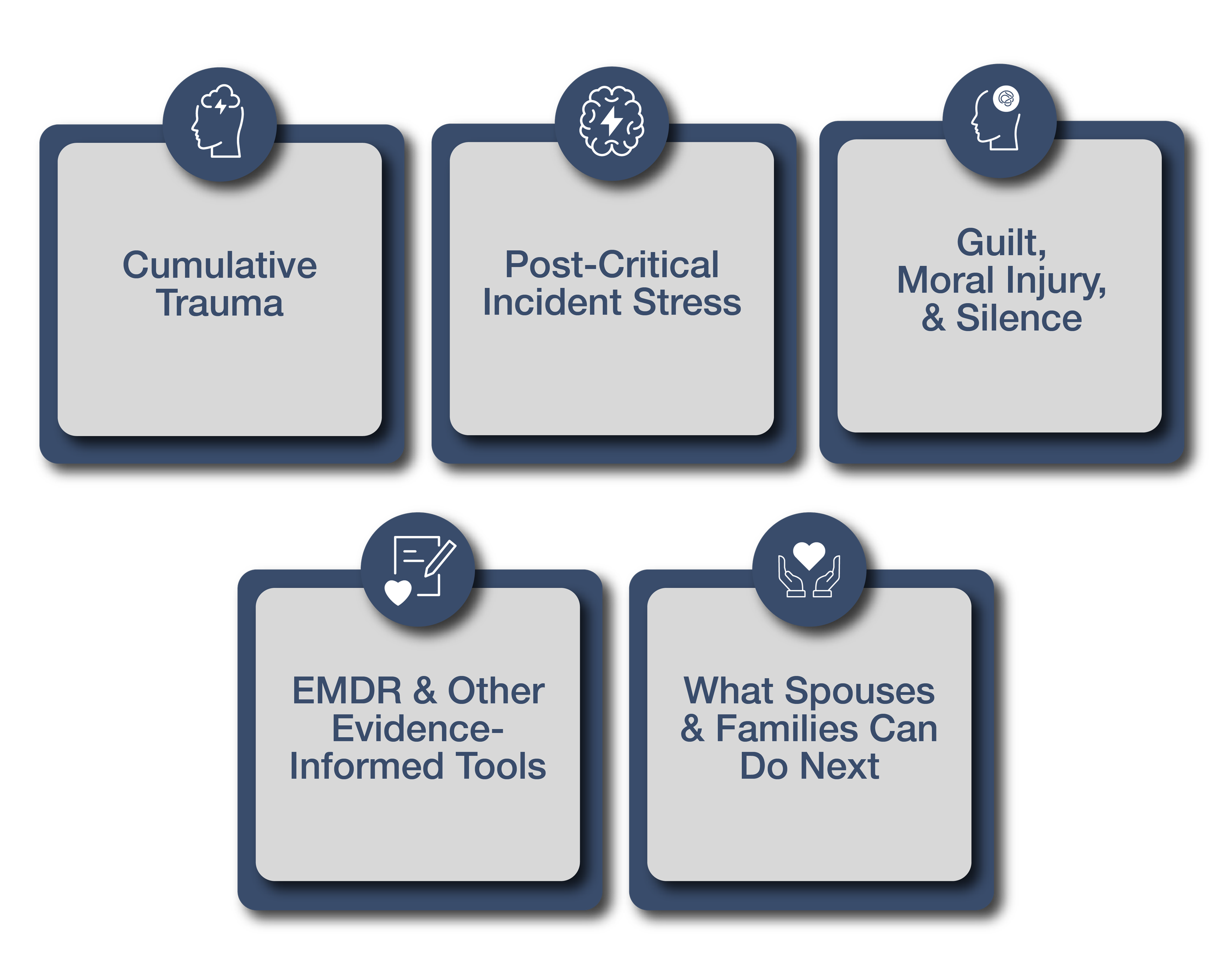 Education and real-world guidance that equips law enforcement families with the information they need to protect what matters most. Each episode brings honest conversations about how cumulative stress impacts the officer beneath the uniform and how families can offer support at home.