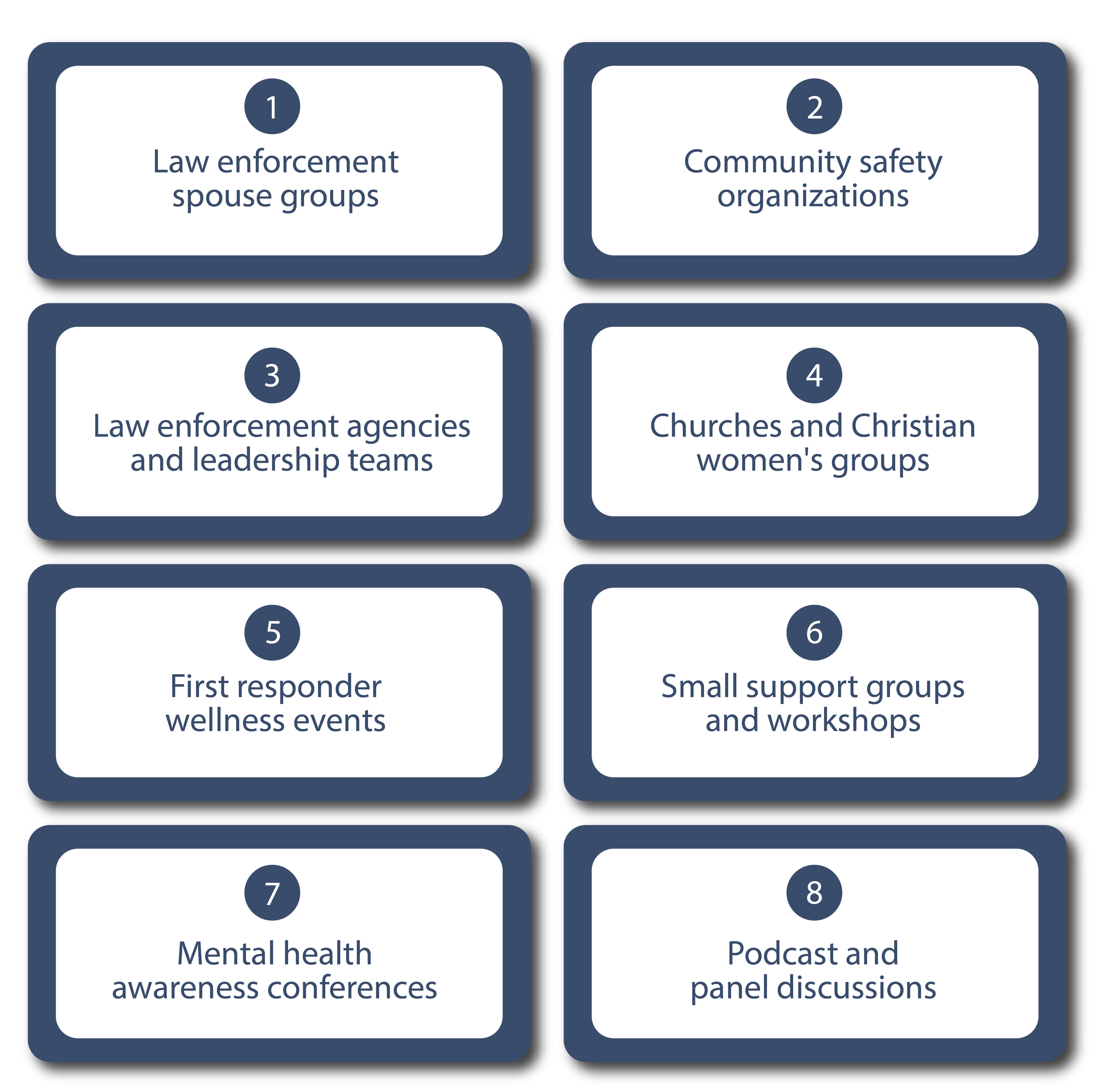 Amy Cortez speaks to law enforcement agencies, spouse groups, churches, and organizations about the hidden impact of the job and how families can play a powerful role in supporting officer wellness.